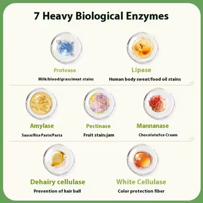 A10: فرمول های کپسول مواد شوینده لکه + بوی ما حاوی آنزیم هایی هستند که با لکه های سرسخت مبارزه می کنند، آنزیم ها مولکول هایی هستند که هدف از حذف یک نوع مولکول مانند پروتئین یا نشاسته هستند.